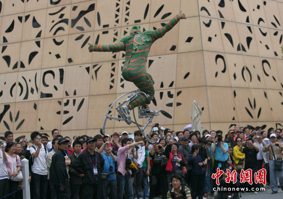 5月4日,上海世博會北京周花車巡游演員在世博園街頭表演。當日,世博會北京周開幕。 中新社發 蘇丹 攝