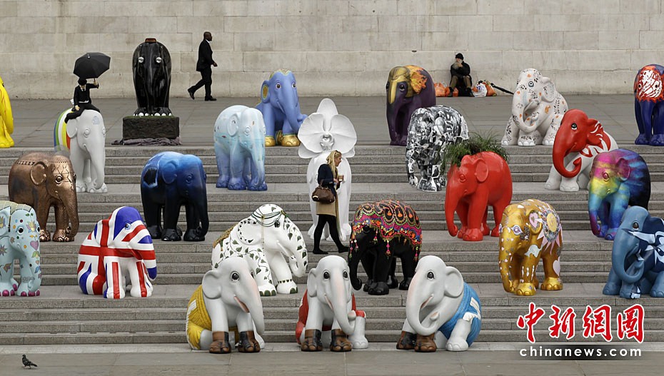 5月4日,2010年倫敦大象游行活動當日在特拉法爾加廣場啟動。260個真象大小的彩繪雕塑將在倫敦各處展出,并將于6月30日拍賣為慈善組織籌款。圖片來源:中國新聞網