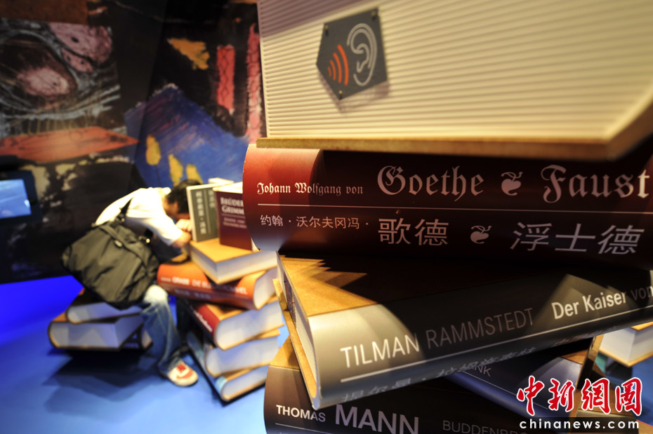 德國文化的展示區,桌面的讀者可不是睡著了,那本書是可以發聲的,他也許是“沉浸”在故事中了。中新網記者 王紅綱 攝