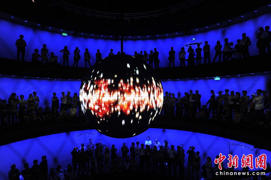 德國館的高潮就是它的最后部分“動力之源”。可以容納600人的動力之源大廳圓形環廊是一個圓錐形空間,中間懸掛著一個重達1.5噸、直徑達3米的巨大金屬球,四周則有一圈供游客駐足的走廊。黑漆漆的大廳里,兩個虛擬主持人邀請觀眾同時大聲吶喊。隨著吶喊聲的加大,動力球慢慢擺動起來,聲音越大擺動幅度越大,甚至繞圈飛行。圓球表面40萬根發光的LED管,逐漸閃現出德國人對未來城市生活的暢想畫面。這是一場7分鐘的互動體驗。在這里觀眾才是主角。中新網記者 王紅綱 攝