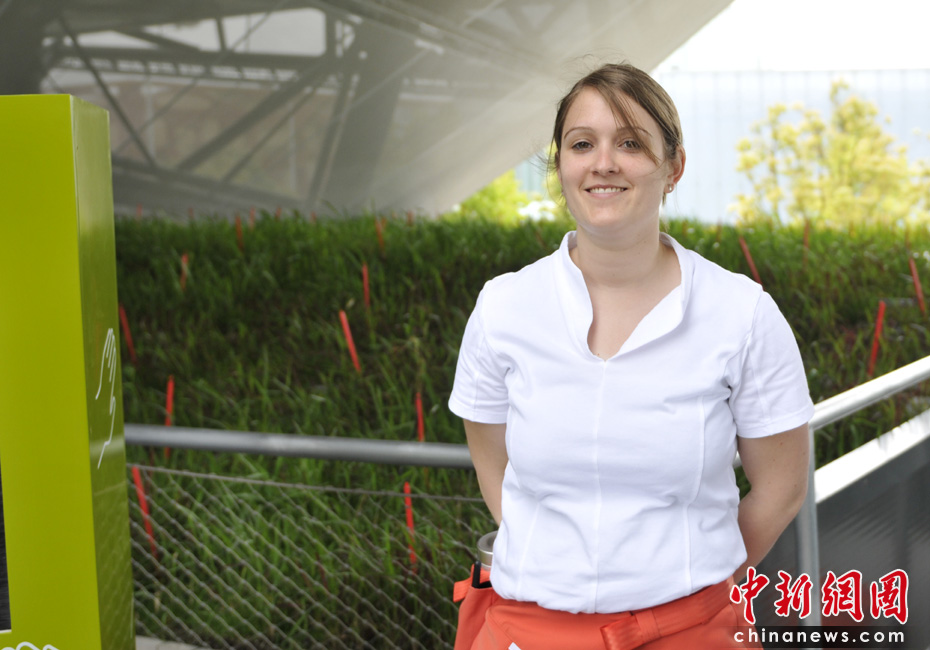 美麗的德國館工作人員,她們都能用一些簡單的漢語與中國游客交流。中新網記者 王紅綱 攝