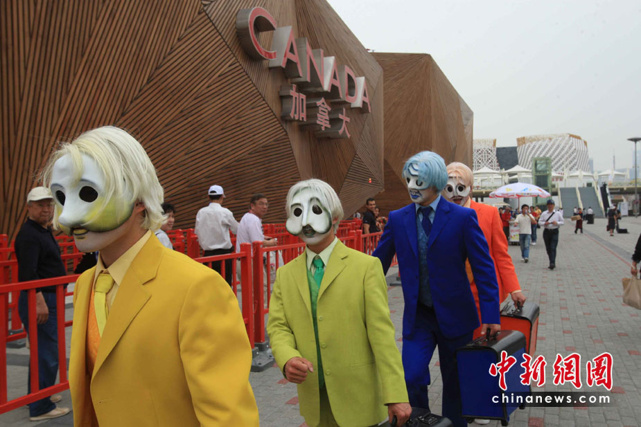 5月6日,幾位穿著艷麗服裝的“藝術家”,走進世博會加拿大館,這是加拿大館的文化推廣內容之一。中新社發 潘索菲 攝