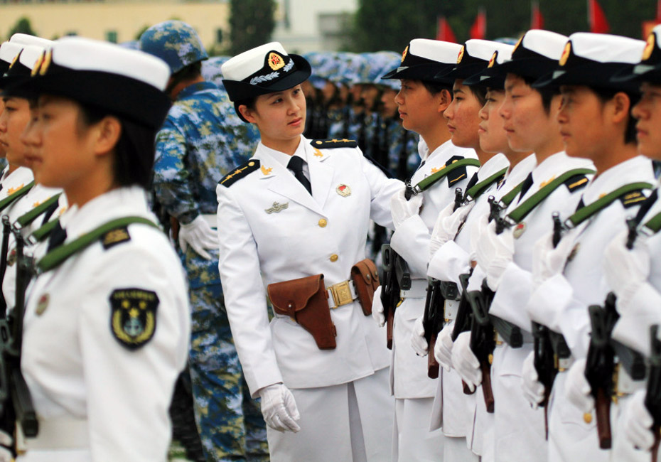 參加閱兵式的海軍陸戰隊女隊員在做準備。圖片來源:新華網 查春明攝