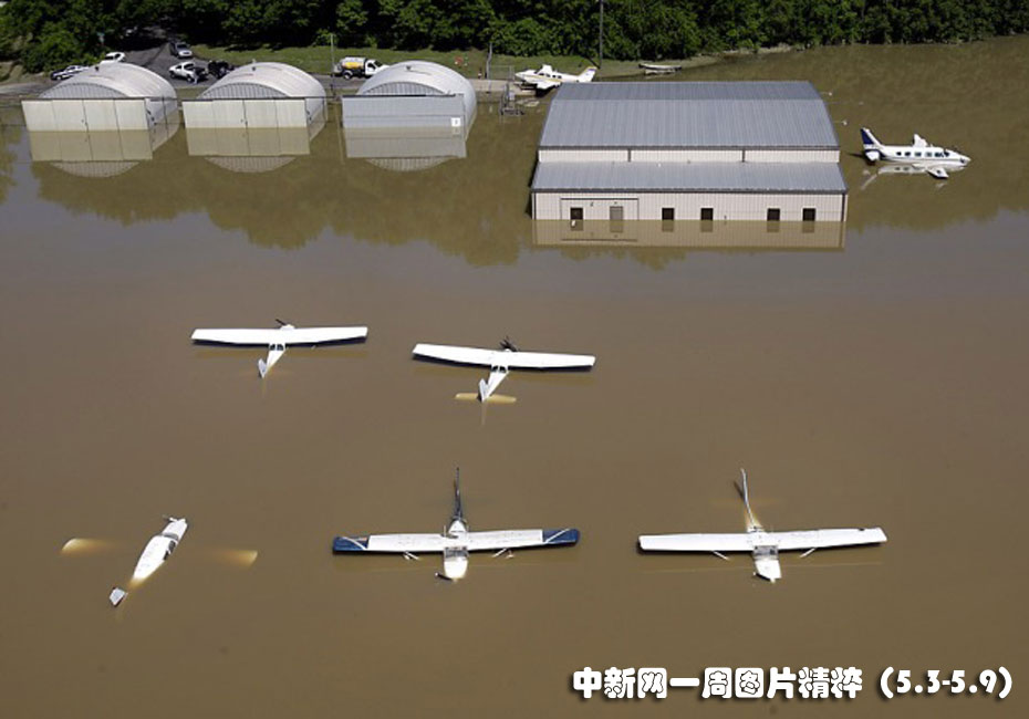5月4日周二,在美國田納西州納什維爾,科尼利亞堡飛機場的飛機浸泡在洪水里。周末的暴雨令坎伯蘭河泛濫,田納西泰坦也變成了一片汪洋。