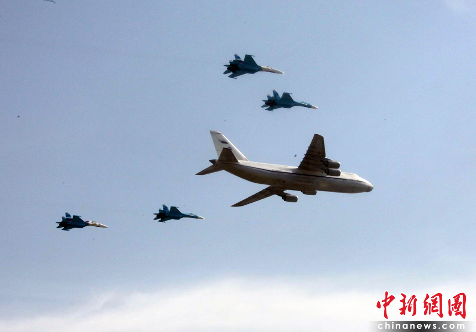 5月9日,俄羅斯在莫斯科紅場舉行盛大的閱兵式,慶祝衛(wèi)國戰(zhàn)爭勝利65周年。莫斯科時(shí)間5月9日上午10點(diǎn)(北京時(shí)間9日下午2點(diǎn))許,閱兵式正式開始。圖為空中梯隊(duì)穿越紅場上空接受檢閱。張朔 攝