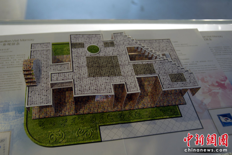 世博園區(qū)內(nèi)的特許商品店里,折紙場(chǎng)館惟妙惟肖,頗受游客的喜愛。圖為韓國(guó)館紙模型。中新網(wǎng)記者 吳歆 攝