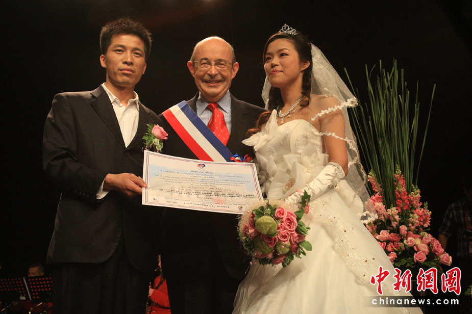 5月11日,35對新人來到世博法國館內舉行婚禮儀式。法國館舉行“法蘭西浪漫婚典”的集體婚禮。圖為法國圖爾市長為參與此婚典的新人頒發“證書”。中新社發 潘索菲 攝