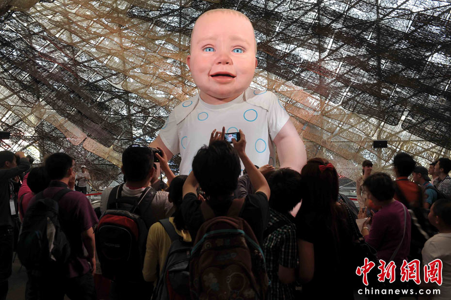 圖為西班牙館內(nèi)的巨型寶寶。 中新社記者 陳文 攝