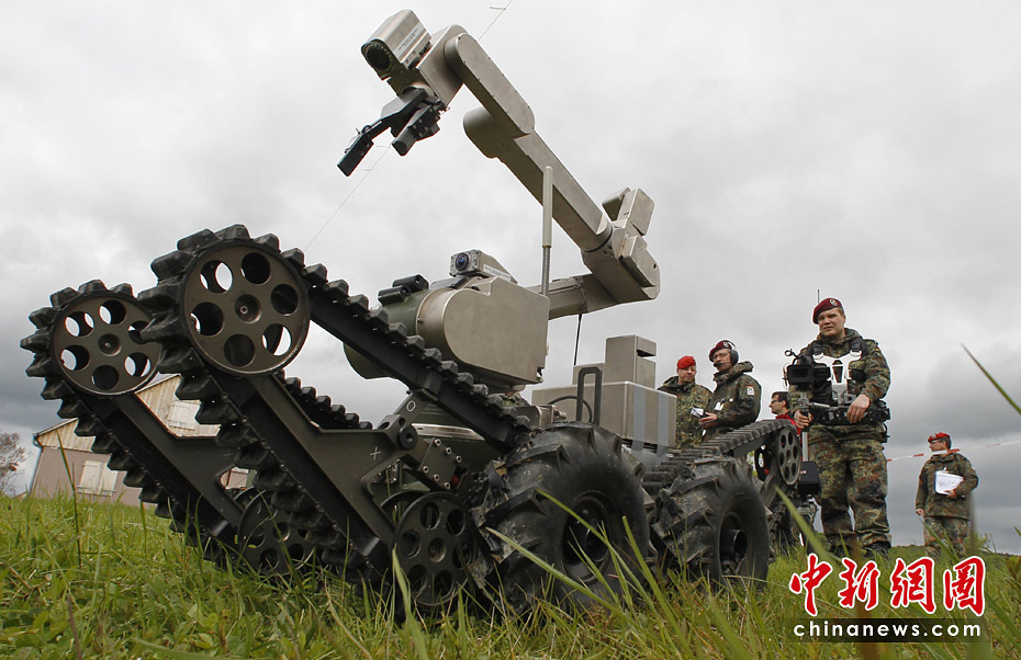 當地時間5月18日,德國南部哈默爾堡舉行了歐洲軍用機器人大賽。歐洲各國軍用機器人在大賽上一展身手。圖片來源:中國新聞網