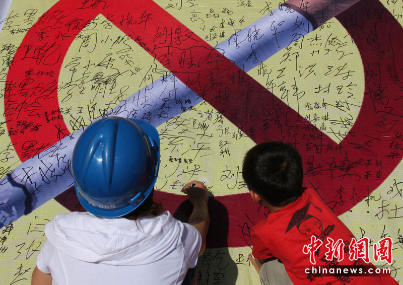5月31日是第23個“世界無煙日”,今年的主題是:性別與煙草——抵制針對女性的市場營銷。吸煙有害健康早已成為不爭的事實。有關醫學研究表明,吸煙可導致心腦血管疾病、癌癥、慢性阻塞性肺病等多種疾病,已成為繼高血壓之后的全球第二號殺手。為了您的健康,請熄滅您手中的香煙。圖為5月30日,河南省湯陰縣一名女電力工人和孩子一起在禁止吸煙標志上簽名,表示要遠離香煙,自覺加入控煙隊伍。常中正 攝