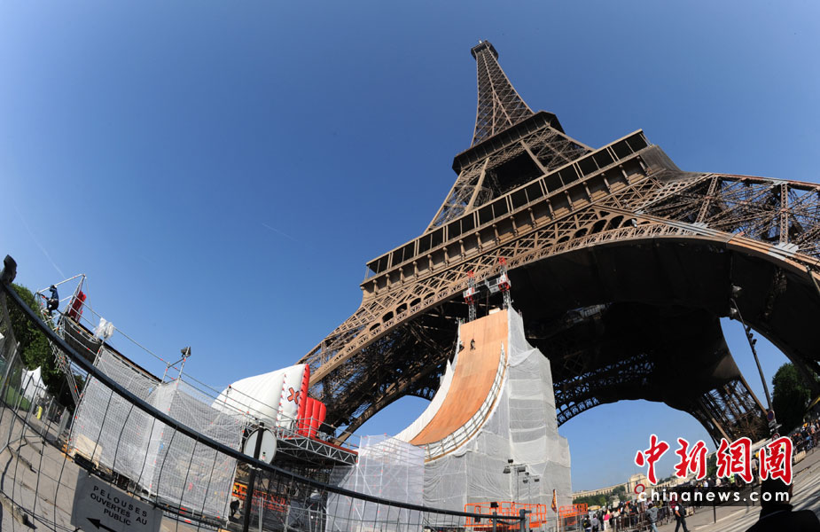 5月29日,法國巴黎,法國極限直排輪冠軍克里斯(Taig Khris)從法國艾菲爾鐵塔跳下,創(chuàng)下世界新自由落體紀錄。