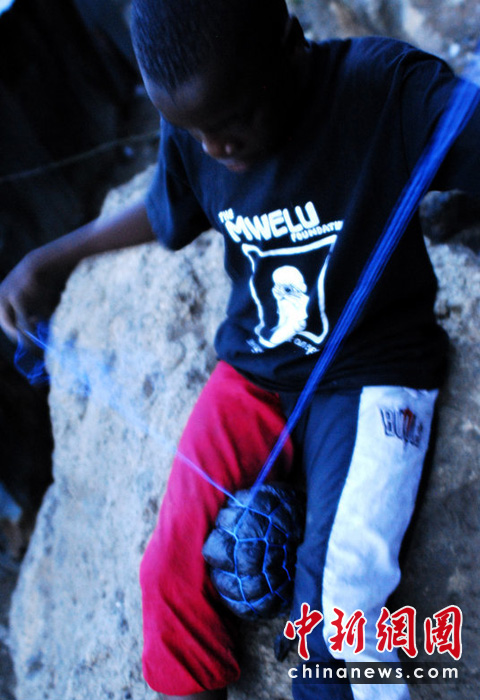 生活在肯尼亞首都內羅畢(Nairobi) Muthare難民營的小孩兒沒有能力買足球、足球鞋,更別說專業足球隊員穿的成套的球衣了。但是這些沒有給他們對足球運動的喜愛產生任何影響。孩子們從當地的垃圾堆撿來塑料口袋和塑料碎片,自己動手做“足球”。 圖片來源:CFP