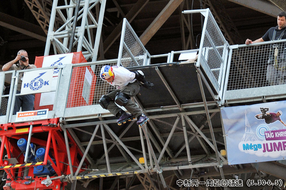 5月29日,法國巴黎,法國極限直排輪冠軍克里斯(Taig Khris)從法國艾菲爾鐵塔跳下,創下世界新自由落體紀錄。圖片來源:中國新聞網>>點擊觀看詳細內容