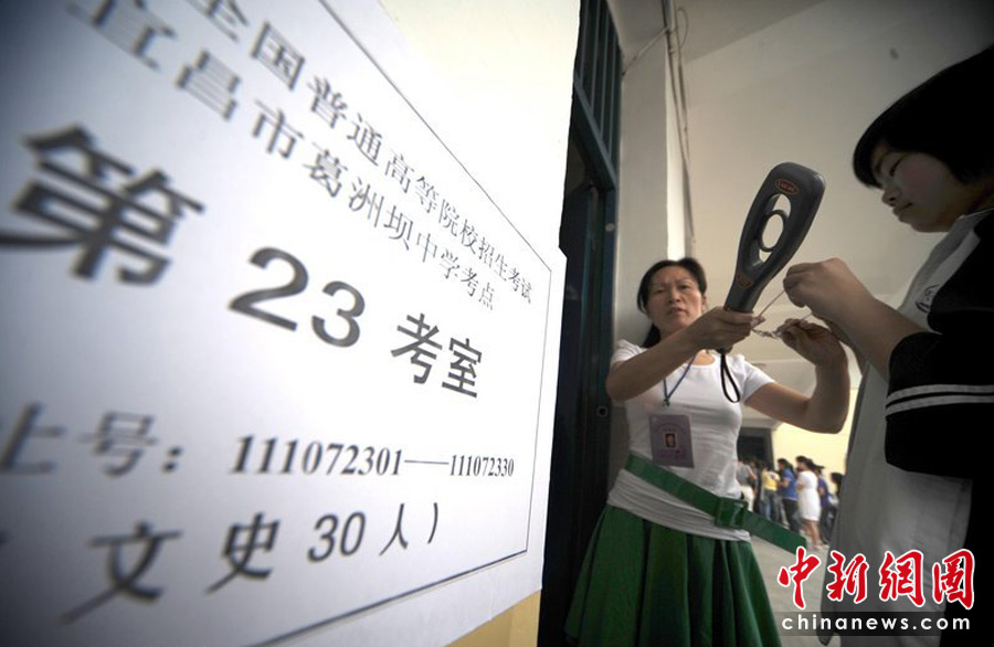 2010年全國高考6月7日日拉開大幕,957萬考生走進考場。由于報名人數減少,而招生計劃增加,教育部預計今年全國高考平均錄取率將會增加近7%。6月6日下午,參加2010年高考的湖北宜昌考生走進葛洲壩中學考點熟悉考場,進場前,監考老師手持金屬探測儀器對考生一一進行認真的安全檢查。劉曙松/CFP
