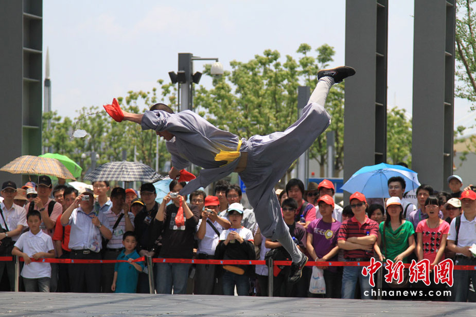 自5月1日開始,上海世博園D片區綜藝廣場每天都有少林寺功夫展演,受到世博參觀者的熱捧。中新社記者 殷春永攝