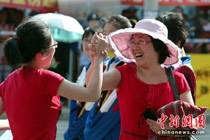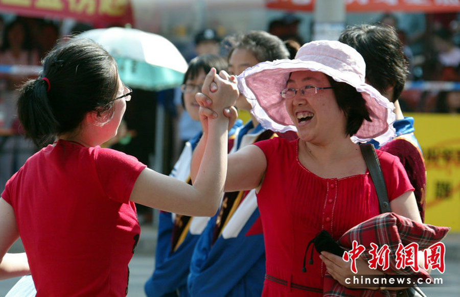 6月7日,為期兩天的2010年普通高等學校招生全國統(tǒng)一考試開考,全國將有957萬考生走進考場。圖為高考第一天,遼寧丹東一中考場外的老師鼓勵準備參加考試的學生獲得好成績。陳浩 攝