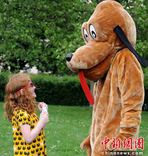 當?shù)貢r間2010年6月6日,英國倫敦舉行卡姆登綠色市集(Camden Green Fair),這是英國倫敦每年環(huán)保領域的“重頭戲”。本屆市集的主旨是要喚起大眾對環(huán)境問題的關注,選擇更加可持續(xù)發(fā)展的生活方式。據(jù)活動主辦方預計,本屆市集將吸引來自英國各地和世界各國的2萬多人參加。圖為素食推廣志愿者扮成卡通狗吸引孩子。Fiona/攝 Fiona 馬小剛/文