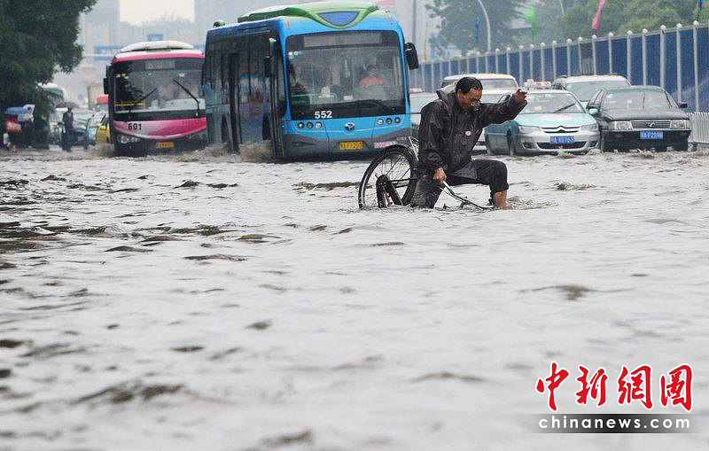 6月8日,武漢持續(xù)降雨,武昌徐東大街汪家墩段,300多米路面積水,最深處超過(guò)半米,車(chē)輛只得緩慢涉水而行。承影/CFP