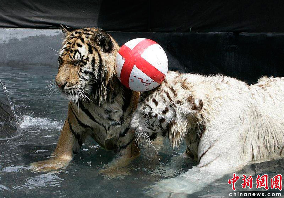 2010年6月7日,美國南卡羅來納州美特爾海灘,在世界杯即將開幕之際,一歲的小白虎Sundaram和孟加拉虎Mukti率先在水里上演了一出足球大戲。英格蘭隊首戰(zhàn)將對陣美國隊,因此足球外側(cè)也被印上了英格蘭旗的標志。cfp