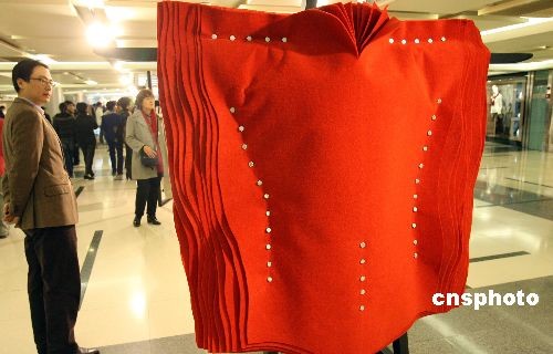 11月8日,“從哪里來——時(shí)裝藝術(shù)國(guó)際展/From Where-- Fashion Art 2008 International在北京國(guó)貿(mào)商城開幕,本次展覽共邀請(qǐng)10個(gè)國(guó)家和地區(qū)88位藝術(shù)家的88件作品,他們分別來自美國(guó)、法國(guó)、德國(guó)、英國(guó)、韓國(guó)、中國(guó)以及中國(guó)香港地區(qū),受邀參加本次展覽的外國(guó)藝術(shù)家有Louda larrain、Johanna braitbart、金暎仁、琴基淑、李知賢等。中新社發(fā) 錢興強(qiáng) 攝
