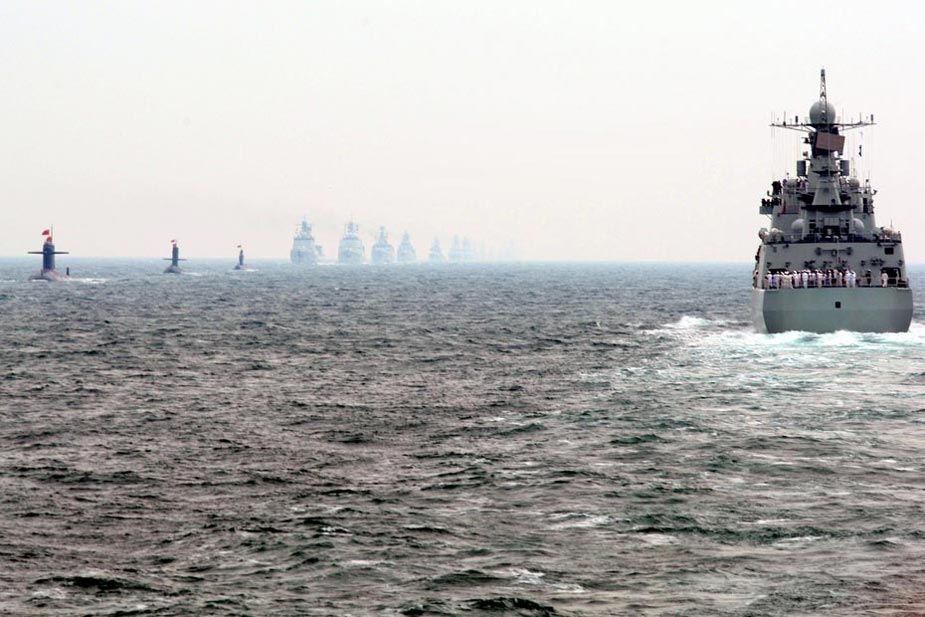 4月23日下午,為紀念中國人民解放軍海軍成立60周年而舉行的海上閱兵在青島附近黃海海域舉行。海上檢閱式分兩個階段,第一階段為海上分列式,檢閱中國海軍的艦艇和飛機;第二階段為海上閱兵式,檢閱來自14個國家的21艘艦艇。圖為接受檢閱的中國海軍潛艇編隊、水面艦艇編隊。 中新社發 宋吉河 攝
