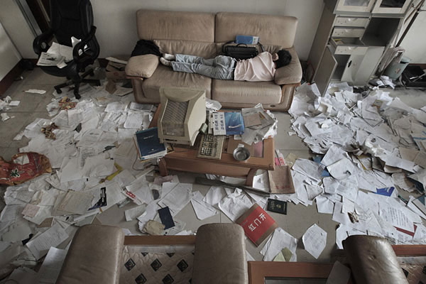 2008年10月14日,一位催討債務的男子在江龍集團銷售辦公室睡覺。受全球金融海嘯影響,國內最大的印染企業江龍集團資金鏈斷裂,企業老板出逃,大批債權人來到集團總部討債。作者:傅擁軍 中國
