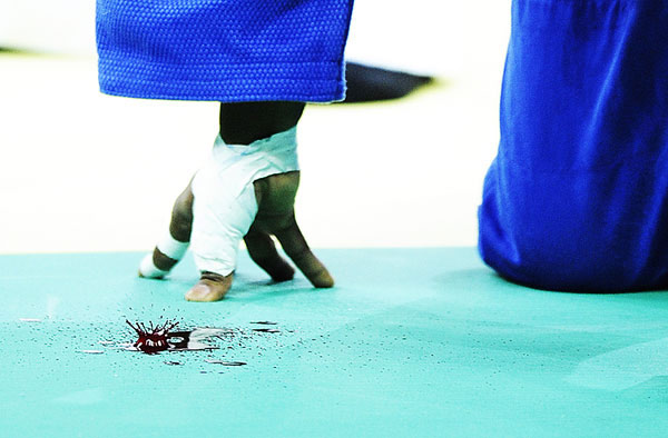 2008年8月11日,北京,海地柔道選手在奧運(yùn)會(huì)女子57公斤級(jí)柔道比賽中頭部受傷,血染賽場。作者:吳曉凌 中國