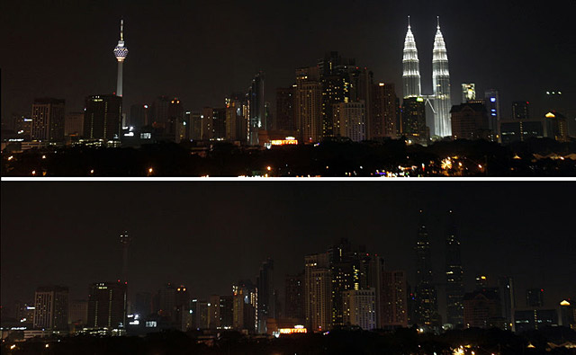 馬來西亞吉隆坡:3月28日,馬來西亞吉隆坡的吉隆坡塔(左)和雙子星塔(右)在參與“地球一小時”熄燈行動前(上)和熄燈后(下)的對比情況。