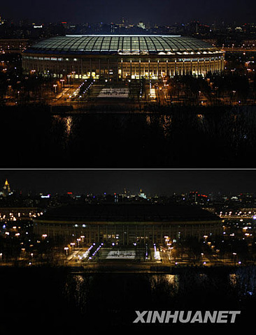 俄羅斯莫斯科:3月28日20時30分后,1980年莫斯科奧運會主體育場盧日尼基體育場熄燈前和熄燈后的對比情況。魯金博 攝(圖片來源:新華網)