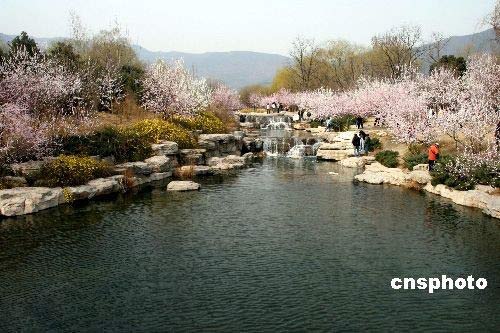 3月20日,北京植物園桃花盛開迎春爭艷,吸引了不少游客。中新社發 李遠志 攝