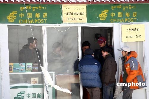 自4月28日,受邀采訪2008北京奧運會火炬接力珠峰展示活動的中外媒體入住珠峰大本營絨布新聞中心后,新聞中心住房、通訊、食宿和醫療等設施齊備且環保,為中外記者提供采訪保障。這里有世界上海拔最高的郵政代辦所,居住的活動房、電力設施、網絡等所使用的均是環保材料,符合珠峰自然保護區的各項環保規定。圖為記者在世界上海拔最高的郵政局-中國珠穆朗瑪峰臨時郵政局辦理業務。 中新社發 盛佳鵬 攝