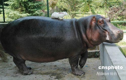 7月6日,在浙江省溫嶺動物園里,巨大的河馬背上趴著一只小白兔,它們一起走動覓食、納涼消夏,讓游客忍俊不禁。中新社發 江勇兵 攝