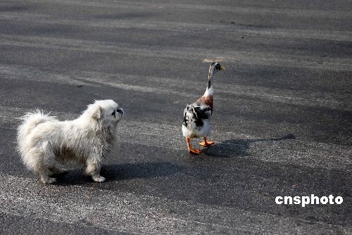 俗話說:狗攆鴨子呱呱叫,然而,家住河南洛陽濱河新村的徐先生家養的小狗“毛毛”和鴨子“鴨鴨”卻是一對莫逆好友,它們同吃、同住、同娛樂,整天形影不離。據徐先生說:“狗鴨已交往了3年,鴨鴨是孩子她嬸送給孩子飼養的寵物,2005年10月,抱回來的時候還是一只毛茸茸的小雛鴨,小家伙一見毛毛就嚇得渾身發抖,到處亂鉆。可是不知道什么時候,它卻與毛毛交上了朋友,還睡到了毛毛的狗窩里,兩個小家伙相依相偎的很和諧。直到2006年6月鴨鴨快一歲了它們才不在一個窩里住,但是鴨鴨和毛毛還是整天形影不離。中新社發 曾憲平 攝