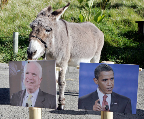 有好事者29日在加利福尼亞做了一個(gè)有趣的試驗(yàn)。讓一頭驢和一頭大象投票。令人意想不到的是,象征著民主黨的驢選擇了麥凱恩,而象征共和黨的大象卻選擇了奧巴馬。