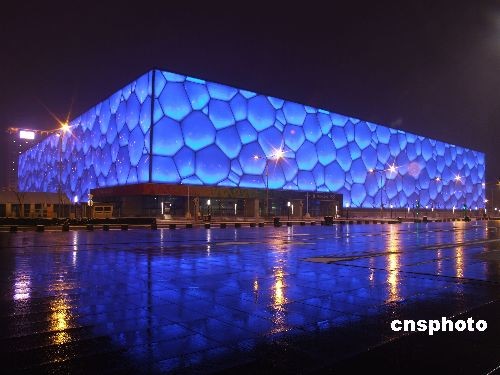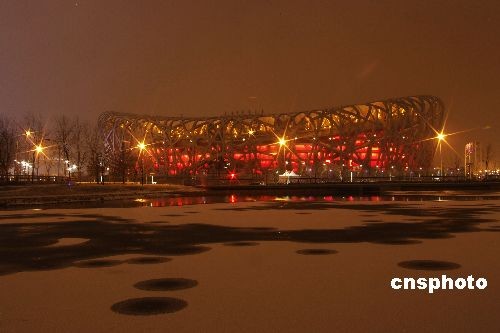 2月17日晚,北京市區(qū)內時有雪意,雖未有大量積雪,但地面濕透的奧林匹克公園中心區(qū)夜景別具風情。中新社發(fā) 馮軍 攝