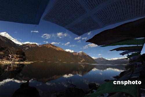 2009年初春,西藏林芝巴松措湖,經幡在湖邊飄舞,人文景觀和雪山圣湖自然景觀圣潔迷人。通過冬季旅游促銷活動,西藏旅游業呈現回暖趨勢,農歷春節期間,西藏旅游業的各項指標開始增長,業內人士認為,即將到來的藏歷新年將更快提升西藏旅游熱度。中新社發 廖攀 攝