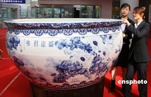 10月18日,2007景德鎮(zhèn)國際陶瓷博覽會開幕。圖為一款名為“盛世名花”的青花釉巨型瓷缸引起觀眾的好奇。這口大缸由景德鎮(zhèn)技師余鵬飛手工拉坯、畫家崔廷玉繪制、經1300攝氏度高溫燒制而成,缸口直徑1.66米,高0.82米,這是當今世界已知最大的一個青花釉瓷缸。中新社發(fā) 吳慶才 攝
