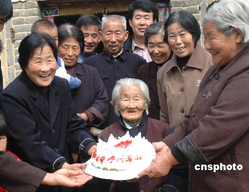 10月18日,河南省社旗縣饒良鎮二戶崗102歲的李秀榮老人與她的大家庭的90多位成員歡聚一堂,喜迎“重陽節”。中新社發 楊銀鵬 攝