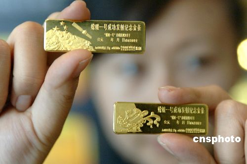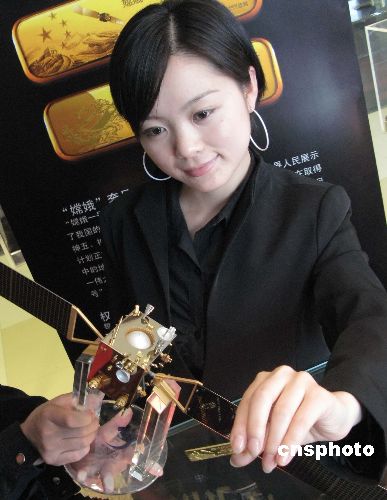 “嫦娥一號”成功發射揭開了中國探月工程的序幕。為紀念這一成就,10月25日,“中國國家博物館藝術品開發中心監制的“嫦娥一號”紀念金條在北京由國道黃金公司宣告發行。“嫦娥一號”紀念金條一套兩根,各為25克AU9999黃金,計限量發行2007套。第一根金條精雕象征中國萬里長城、五星紅旗和“嫦娥一號”在太空飛行的姿態;第二根金條雕刻有嫦娥奔月的傳統神話圖案,寓意國人千年的夢想開始變成現實。金條背面雕刻的是“嫦娥”一號在太空的運行圖。該紀念金條經專業黃金工藝大師構思設計完成。圖為公關員持金條在鍍金的“嫦娥一號”配送禮品前亮相。中新社發 鄒憲 攝