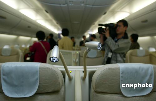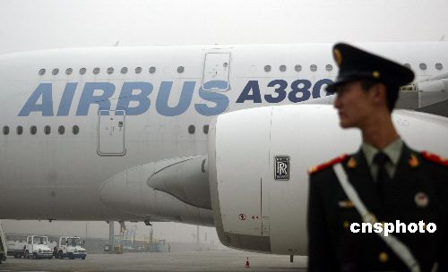 10月26日,生產編號為007的空中客車A380客機?吭诒本┦锥紘H機場N104機位,接待北京媒體及部分嘉賓的參觀。此次A380中國大陸之行為期一周,包括廣州、上海及北京三個城市,這是A380飛機2007年環球飛行之旅的重要部分。當日因北京的大霧天氣,空中客車公司取消了A380北京體驗飛行的計劃,但將繼續其在中國大陸之行最后一站的展示活動。中新社發 楊可佳 攝