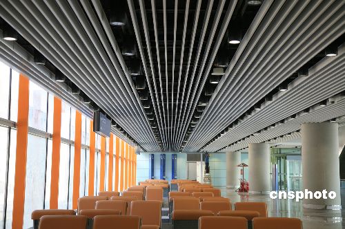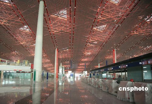2007年11月6日,被尊稱“國(guó)門工程”的2008年北京奧運(yùn)會(huì)項(xiàng)目——首都機(jī)場(chǎng)三號(hào)航站樓工程露出廬山真面目,內(nèi)部精裝修、機(jī)電設(shè)備、信息系統(tǒng)等項(xiàng)目基本完工,近日進(jìn)行驗(yàn)收。首都機(jī)場(chǎng)三號(hào)航站樓是北京2008年奧運(yùn)會(huì)項(xiàng)目,該航站樓總建筑面積90.2萬(wàn)平方米,長(zhǎng)2900米,寬790米,建筑高度45米,由T3A主樓、T3B國(guó)際候機(jī)指廊、T3C國(guó)際候機(jī)指廊組成,其中三號(hào)航站樓主樓建筑面積達(dá)55萬(wàn)平方米,是國(guó)內(nèi)目前最大的單體建筑。中新社發(fā) 洪濤 攝