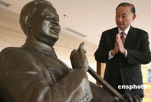 十一月二十三日,坐落在梅蘭芳大劇院內大廳中央的梅蘭芳銅像正式亮相,梅蘭芳之子梅葆玖在銅像揭幕儀式上流露出對父親的深情。中新社發 張勤 攝
