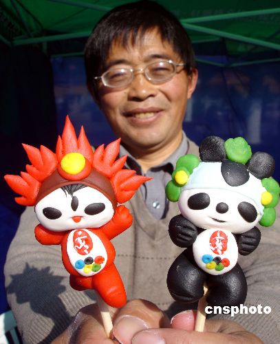 2007年12月5日,蘇州面塑藝人呂樹華用一雙巧手捏出的奧運福娃造型面塑作品,形象逼真、可愛,表達(dá)了他對2008年奧運會的美好祝愿。中新社發(fā) 王建康 攝