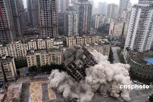 12月6日15時,隨著一聲爆破聲起,位于重慶市主城鬧市的一棟25層、78米高的爛尾樓轟然倒下。該樓是中國西南地區到目前為止爆破拆除的最高大樓,也是重慶用爆破方式拆除的最大一座爛尾樓。中新社發 郭晉嘉 攝