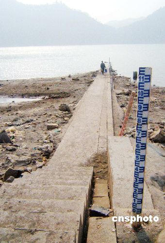 2007年12月7日,湖北宜昌江段裸露的江灘和水位標尺。目前長江已進入一年一度的枯水期,近期長江中游水位持續(xù)退落,比多年同期平均水位低近1.5米,根據當前枯水形勢及水位水情特征,長江航務管理局決定,長江中游實施二級橙色預警。對通過中游的船舶吃水深度進行規(guī)定,普通貨船實際吃水控制在2.4米及以下,危險品船舶實際吃水控制在2.3米及以下,下行船舶超過吃水限制的一律在宜昌港減載。中新社發(fā) 任衛(wèi)紅 攝