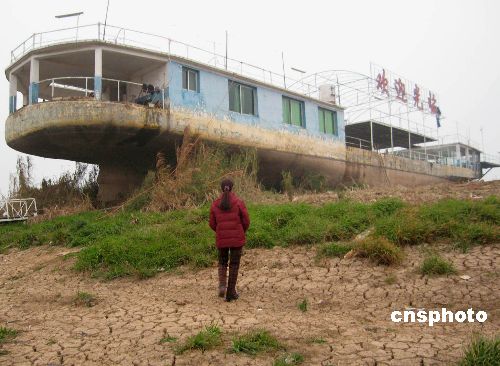 12月10日清晨,湖南境內(nèi)湘江流域長沙段面臨最低枯水位,游船高高擱淺在干涸的河床上。2007年汛期之后,湖南省降雨持續(xù)偏少,旱情迅速發(fā)展,已持續(xù)兩個多月,湘江水位持續(xù)走低,部分江段出現(xiàn)歷史記載以來的最低水位。據(jù)統(tǒng)計,目前湖南全省因旱造成4500多個村民組8.3萬多人及4萬多頭大牲畜飲水困難。中新社發(fā) 劉雙雙 攝