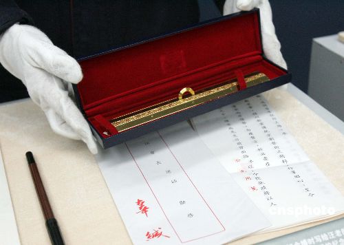一把贈與汪道涵先生的辜振甫夫婦金婚紀念品——金鎮紙,在上海成為記錄海峽兩岸交流的珍貴見證,并將于十二月十一日在“跨越海峽 情系浦江——滬臺交流二十年影像展”中與公眾見面。圖為工作人員小心翼翼的擺放該展品。中新社發 潘索菲 攝