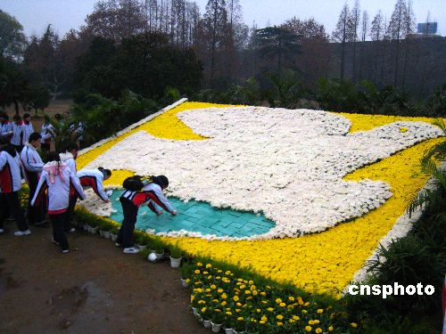 2007年12月13日是“南京大屠殺”70周年紀念日。12月12日,南京人民為寄托對南京大屠殺遇難同胞的衷思,他們用菊花在南京玄武湖環湖路明鏡廣場組成一只巨型和平鴿。“和平鴿”面積達70平方米,象征南京大屠殺遇難同胞70周年忌日;用25550支菊花,寄托著70周年的25550天對遇難同胞的哀思;振翅起飛的和平鴿,寓意中國人民向往和平的美好心愿。圖為一群學生在用菊花拼和平鴿。中新社發 谷昌旺 攝