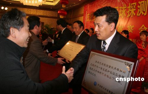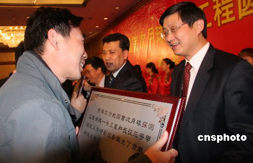 十月十二日晚,作為中國首顆月球探測衛星“嫦娥一號”及其運載火箭“長征三號甲”的研制單位,中國航天科技集團公司當晚在北京舉行答謝宴會,向為該集團承擔首次月球探測工程研制任務提供幫助和支持的協作、配套單位致謝,并向一百四十九家協作及配套單位授予牌匾和證書。中新社發 孫自法 攝