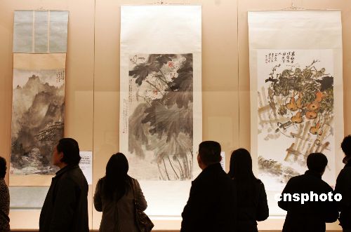 十二月十四日,中國(guó)畫壇三大巨匠張大千、劉海粟、朱屺瞻的作品在上海《虹口緣》書畫藝術(shù)邀請(qǐng)展上同時(shí)亮相,吸引觀眾。三位大師都曾在上海虹口區(qū)生活過(guò)。與虹口區(qū)結(jié)緣的還包括魯迅、蔡元培、沈尹默、 豐子愷、李叔同等,這些文人墨客的百件重要真跡也同時(shí)展出。中新社發(fā) 潘索菲 攝